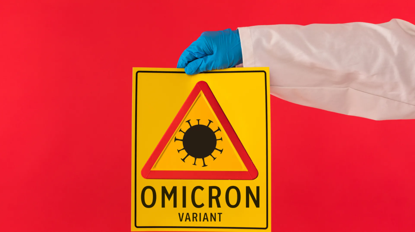 Arm of a doctor wearing a gown and latex gloves holding a yellow sign with a symbol with a covid-19 danger triangle and omicron variant, on a red background. Concept of coronavirus, health, pandemic, quarantine.DBenitostock 文 / Carolyn L. Todd