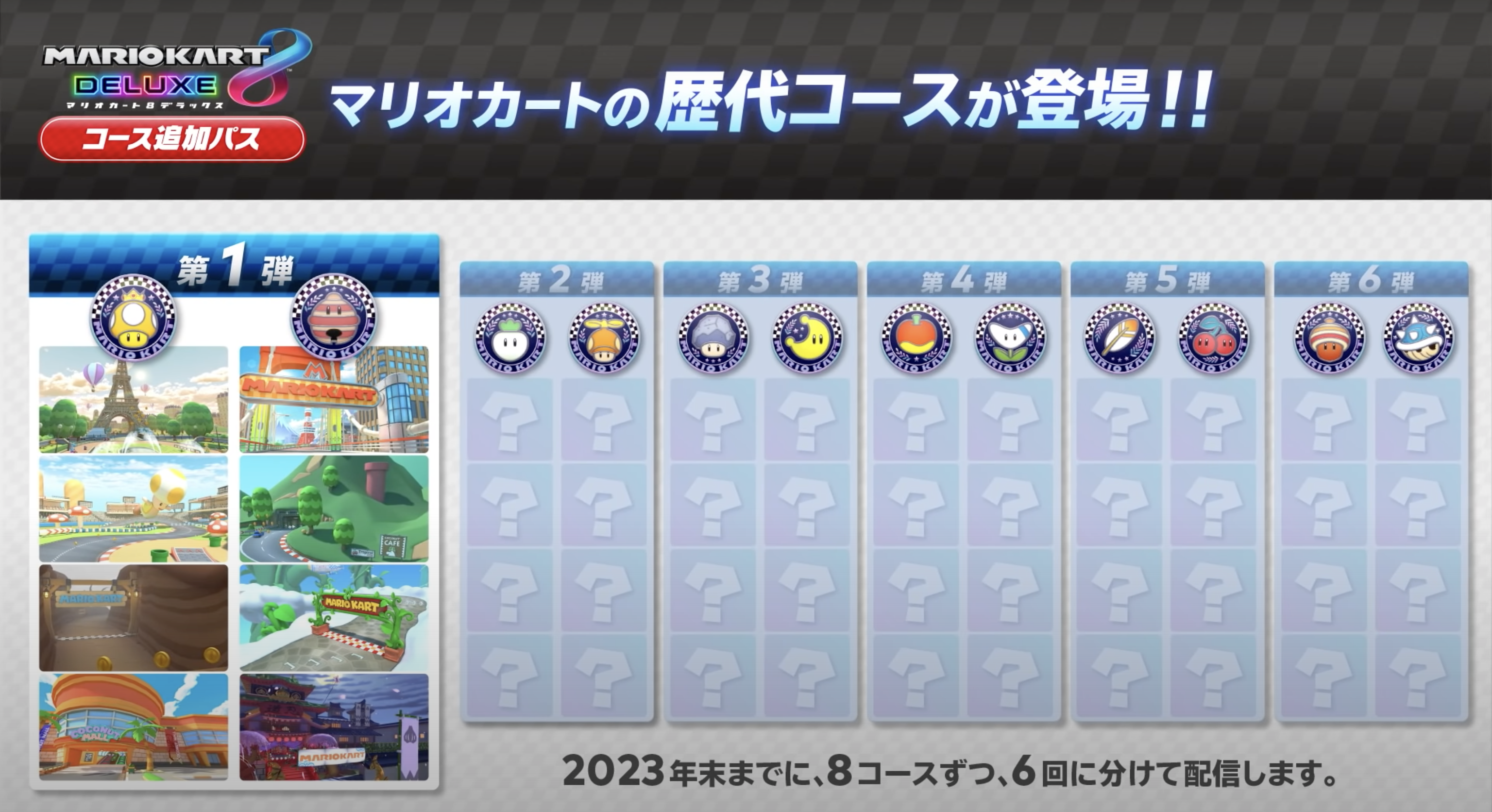 《瑪利歐賽車 8 豪華版 新增賽道通行證》將從系列歷代作品中,嚴選並把賽道重製加入這次的更新內容中,總計分成 6 波推出 48 條賽道,首波擴充內容預計在今年 3 月 18 日正式發售,價格為 2500 日圓(約新台幣 600 元),第 1 波新增賽道包括《瑪利歐賽車 Wii》椰子廣場、《瑪利歐賽車 64》巧克力山、《瑪利歐賽車巡迴賽》巴黎兜風、東京賽道、忍者道場、《瑪利歐賽車 7》奇諾比奧賽道、《瑪利歐賽車 DS》蘑菇山脊路、《瑪利歐賽車 GBA》空中花園等 8 條橫跨各式版本的經典賽道。