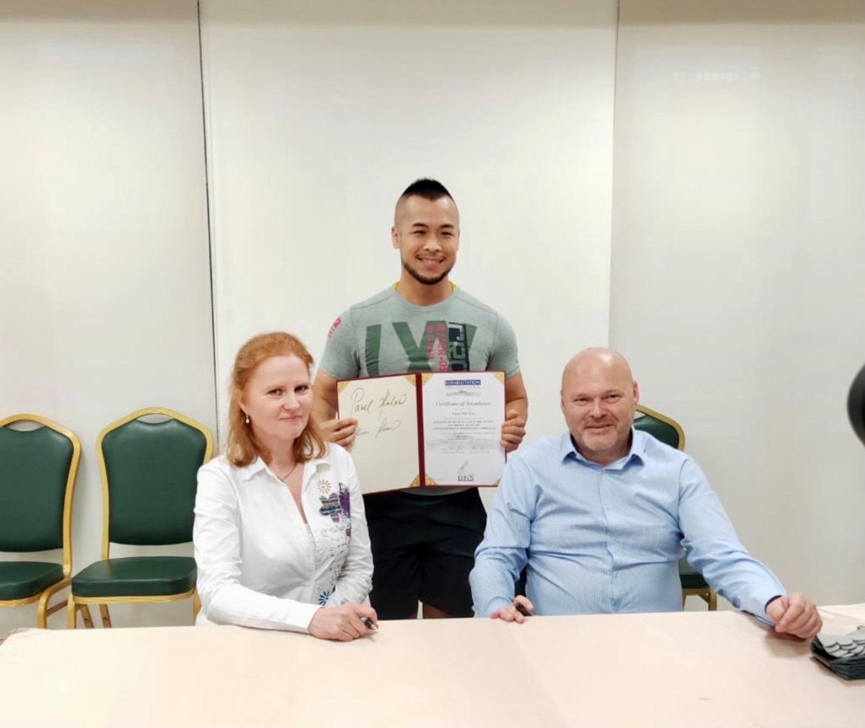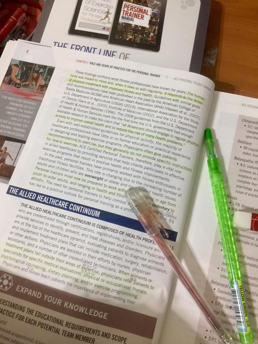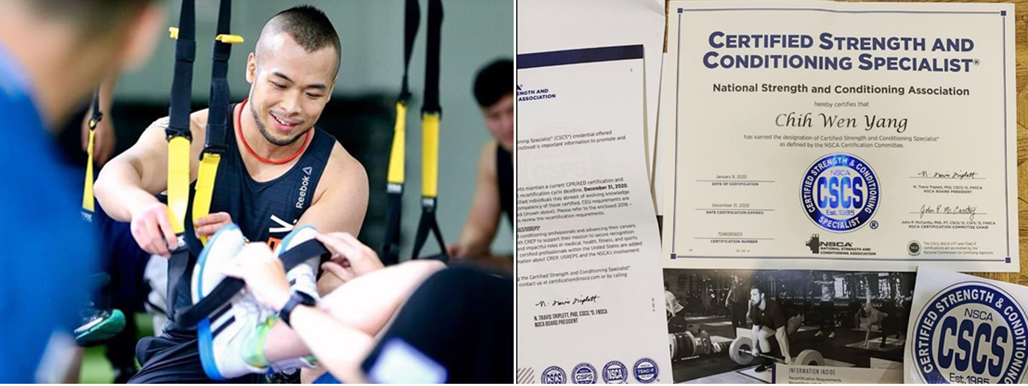 在2017年左右,台灣漸漸興起了一些國際課程、證照培訓單位,我參加了密集的學術科的受訓,考到了第一張國際教練證照《美國運動協會-私人教練》(ACE-CPT) ,從此正式轉戰私人教練。隔年為了專心準一張極為挑戰的教練證照考試: 《美國國家肌力與體能協會-肌力與體能訓練專家》(NSCA-CSCS),也為了在專業領域的精進上全速前進,我暫停了所有團體有氧課的教學。
