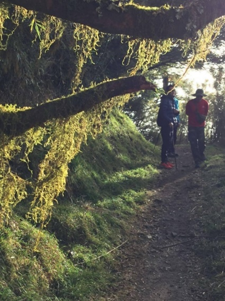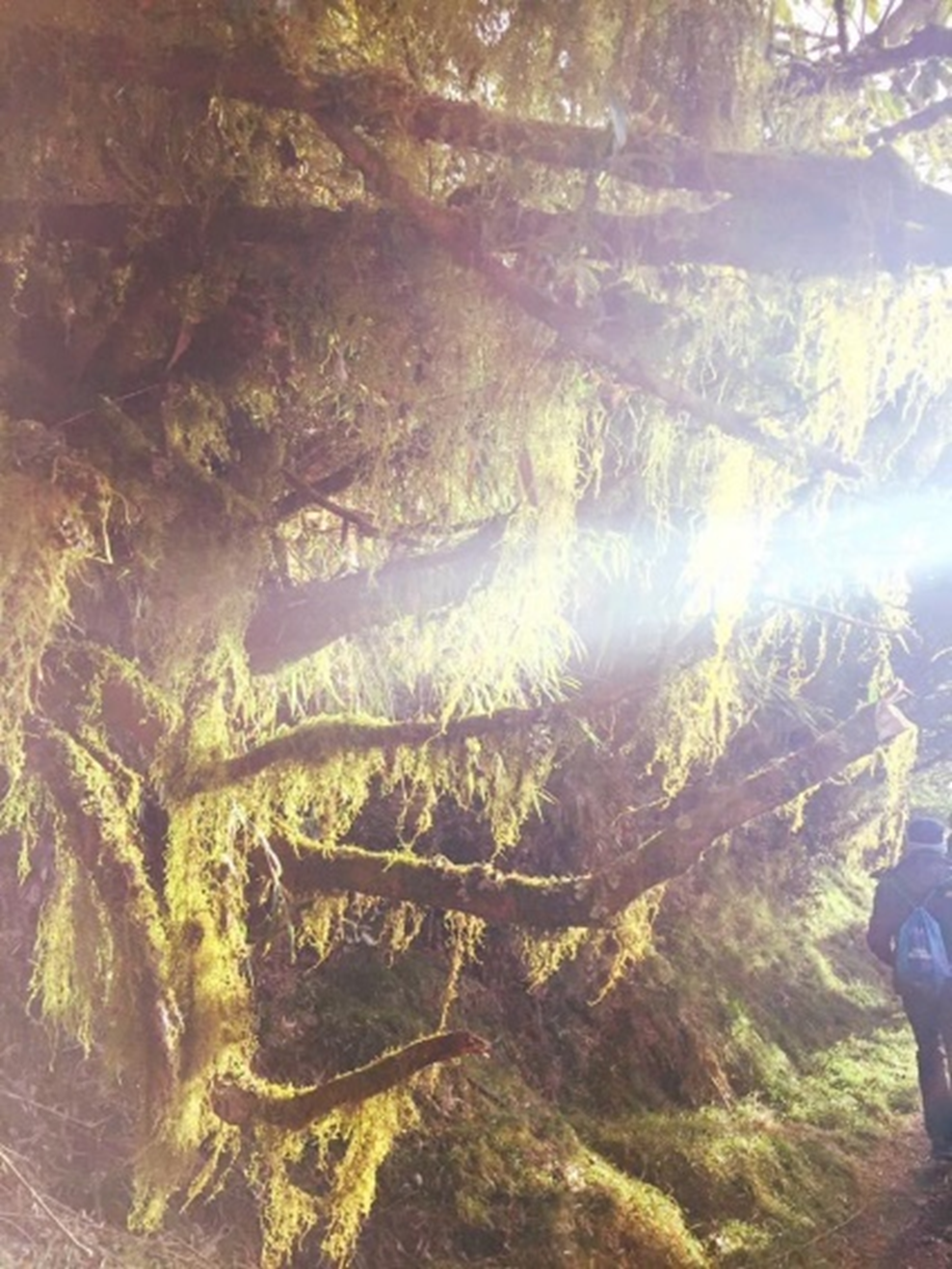 在登山的沿途中,我看見、真切感受到大山想要給予我的信息,豐沛沁涼自山壁縫隙中湧出的泉水、被朝露浸濕的青翠植披與蕨類、嵾天挺拔的樹木、在風中搖曳的藤蔓與松蘿、饒繞在山林中的氤蘊水氣與雲霧、自當中灑下的和煦陽光,都充滿著無窮的生機與感動,反觀自己,像是只顧鑽著情感上牛角尖的一灘死水…山與我,是兩個極為強烈的對比。