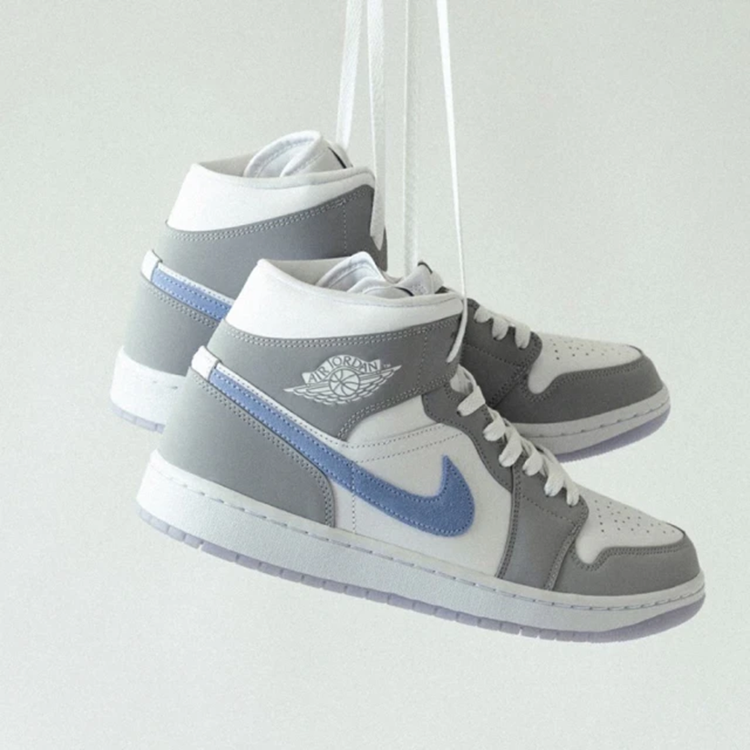 這款高筒的 W Air Jordan 1 Mid Wolf Grey 設計是使用灰白色鞋身搭配水藍LOGO勾,舒適又不失時尚感 (此款版型較小,男聲請購買大半號)。