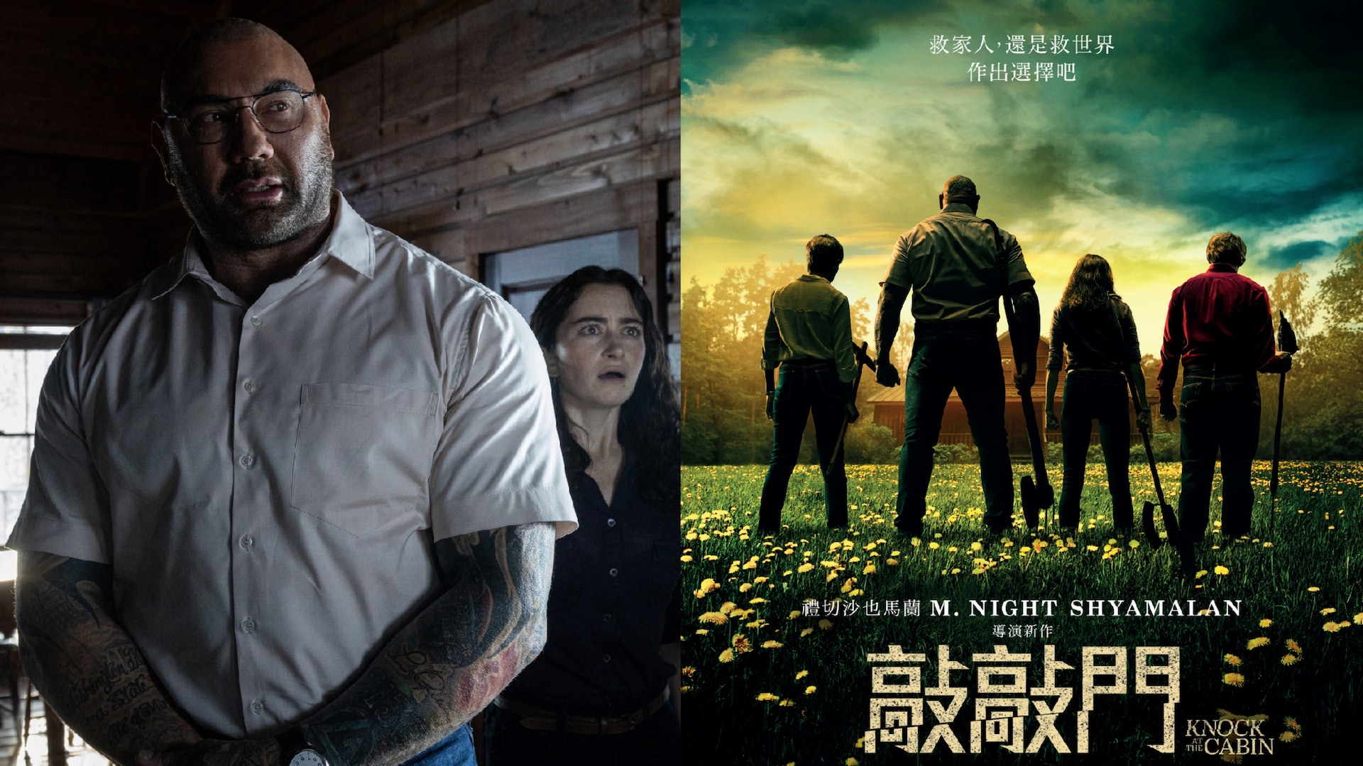 「敲敲門 Knock at the Cabin」是一部2023上映的末日驚悚電影,改編自美國作家「保羅·崔布雷」的暢銷小說『世界盡頭的小木屋』,劇情講述小女孩「溫」與兩個爸爸「安德魯」及「艾瑞克」在偏遠小木屋度假享受悠閒的家庭時光,但四名有持武器的陌生人突然闖入,將一家人挾持為人質並告訴他們「世界末日」即將來臨,而唯一拯救世界的方法,就是安德魯一家三口必須犧牲一人才能阻止災害發生...