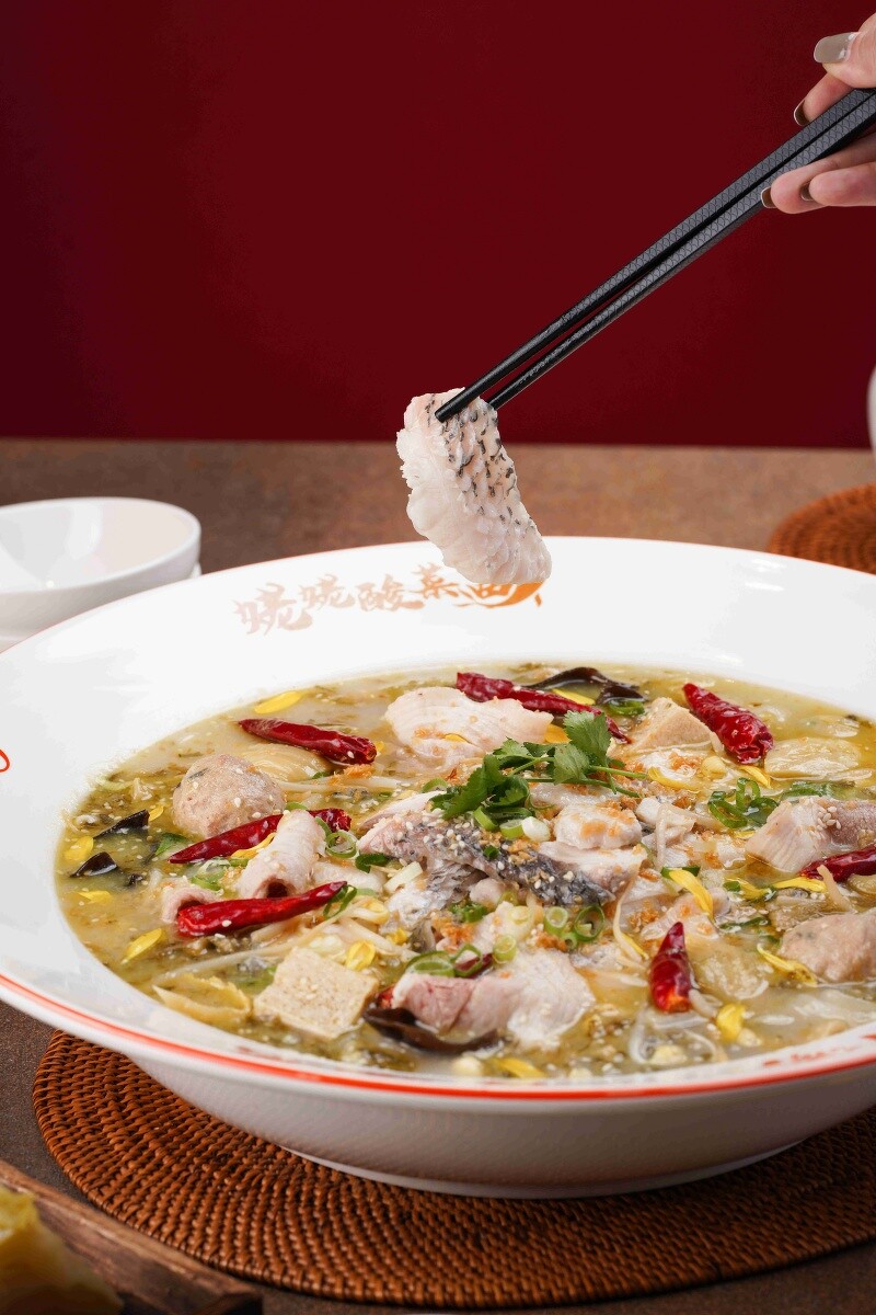而湯頭的部分,則是加入魚皮、魚骨及雞骨長時間燉煮,再搭配姥姥酸菜來增加豐富的風味層次。而魚片則採用營養價值高且肉質細嫩的烏鱧魚,起鍋前再淋上爆香的花椒油、蒜頭與芝麻,以增添香氣。最後,撒上辣椒乾、蔥花與香菜點綴,讓整道菜色風味更具深度。如果喜歡吃辣的朋友,還可以自行加入泡椒增加辣度!