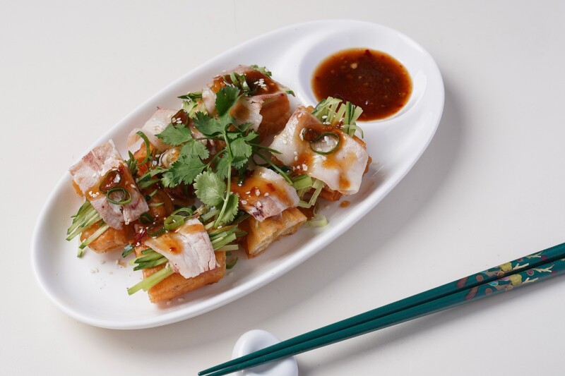 「蓬萊蒜肉」是姥姥獨創菜色之一,無論在味道還是製作過程上,都別具特色!以香脆可口的油條為基底,搭配清脆爽口的小黃瓜與豬五花肉絲。接著淋上秘製蒜醬,口感層次豐富,絕對是不可錯過的美食!