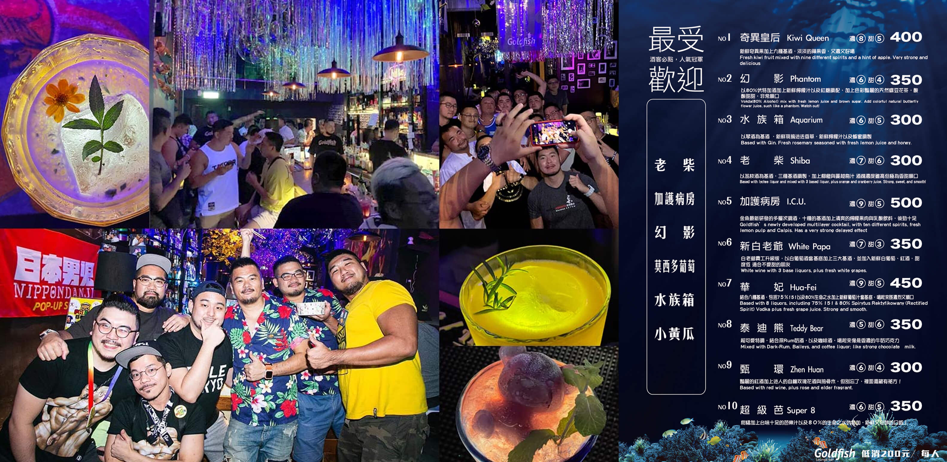 除了音樂,「Goldfish」的調酒也是一大特色,從微醺到重感的調酒應有盡有,特色名稱也讓挑選酒的同時趣味更增加,如果你想把自己或同行者灌醉,那麼請來一杯「加護病房 I.C.U.」!