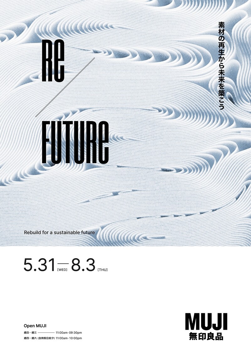 1樓會有12坪的「Open MUJI」空間,可做為辦展覽、講座使用,首波「RE/FUTURE」展覽由台灣企畫,以玻璃、塑膠、廢輪胎、丹寧褲、植林木及物流紙箱等回收再生物件為主,傳遞「友善環境及永續」的品牌理念精神。而店內也有「Re Park」再生服務,設置「丹寧衣物再生箱」、「玻璃再生箱」、「食物共享服務」與「保養瓶罐再生箱」,邀請民眾一起為永續循環盡心力。