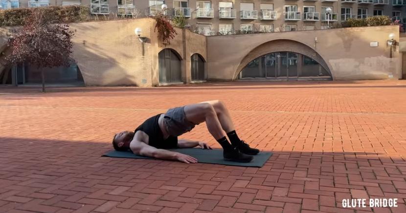 臀橋是適合初學者在家進行的徒手運動。首先躺在地面上,屈膝讓腳掌踩地。然後用腳向地面施力,並將臀部抬起,正如 Lyons 所說的:「夾緊屁股!」直到臀部和大腿成一直線。然後將臀部放回地面。