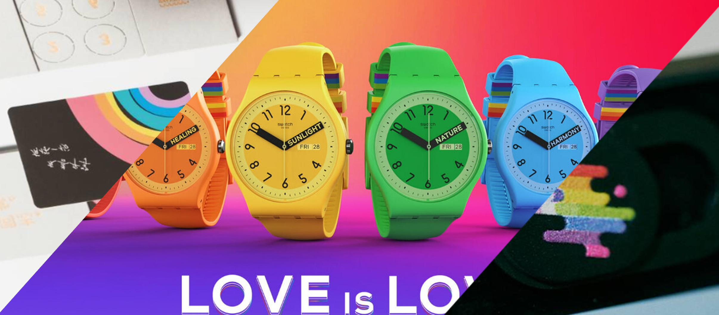 2023年 瑞士手錶品牌 「Swatch」 以 「Pride」 旗幟為設計靈感啟發,推出六種顏色的錶款來頌揚美好理念,分別象徵生命、療癒、陽光、自然、和諧等意義,且獨特的二邊長度對稱秒針象徵萬物平等概念,兩個彩虹錶環更將各種顏色融合為一,展現出共融精神與多樣性。
