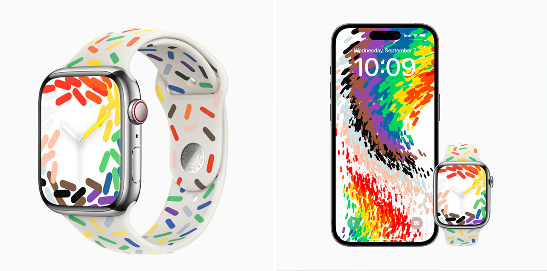 Apple 為向保護並促進全球 LGBTQ+ 社群致敬,在 2023年 推出了全新「驕傲特別版運動型錶帶」,錶帶以白色基底融入歡樂的彩虹幾何形狀,除了採用彩虹旗的顏色外,更加上了其他五種顏色象徵更多元 LGBTQ+ 的族群。 iOS 也同步推出與錶帶相呼應的背景圖片詮釋 LGBTQ+ 社群的相互支持力量。