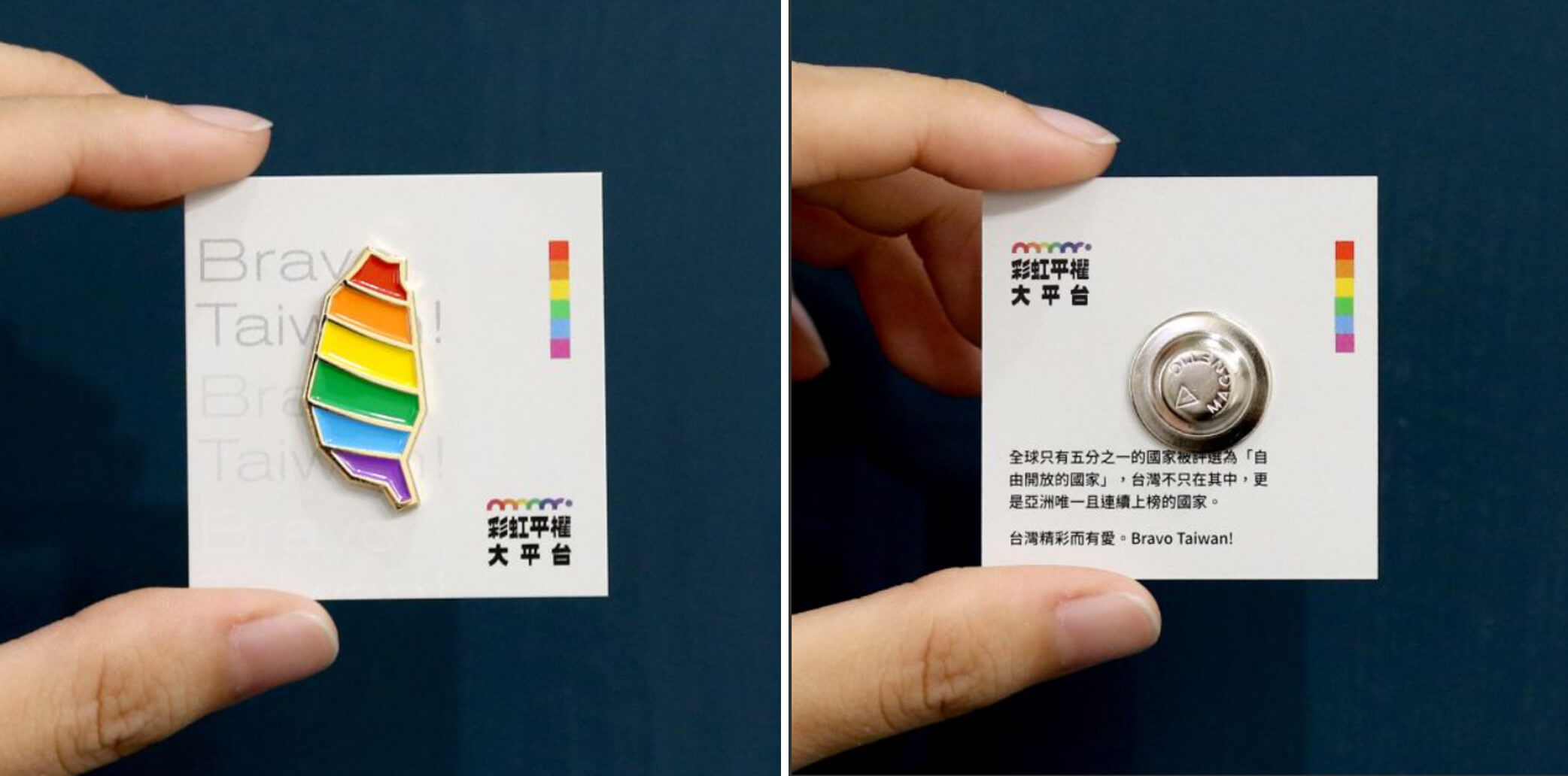 台灣的多元美好值得每個人感到光榮,一起驕傲的別上金彩台灣徽章!被稱為同遊必備小配件的「金彩台灣」同婚元年紀念徽章,以低調卻又尊榮的金色鑲邊,象徵擁抱你我的彩虹驕傲;深愛這片土地且信仰民主的台灣人,絕對不能錯過,利用小小的徽章就能大大宣揚專屬於你的「台灣價值!