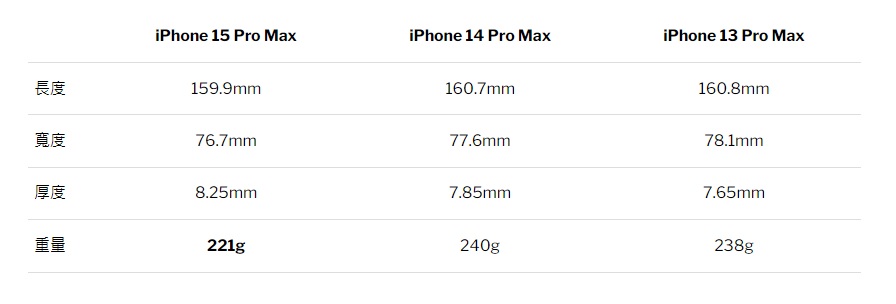 至於重量部分,iPhone 機種自 iPhone X 發表以來逐年增加,iPhone 14 Pro Max 更已來到 240g,對天天手機不離身的現代人而言是個不小的負擔。而今年改用鈦金屬外框後,iPhone 15 Pro 重量為 191g、iPhone 15 Pro Max 重量為 221g,都比前代輕了 12g、15g,還有可能挑戰歷代最輕 Pro Max