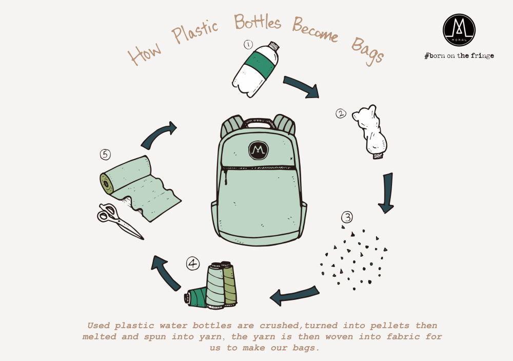 為了對地球永續盡一份心力,愛護我們的生活環境,來自於澳洲的Moral Bags,以「環境保護」及「可持續發展」為品牌精神,使用回收塑膠瓶,透過壓縮、分解、抽絲,最後再製成為rPET面料,並經由設計師的巧思,成為一個個時尚且具街頭潮流風格的綠色環保包。