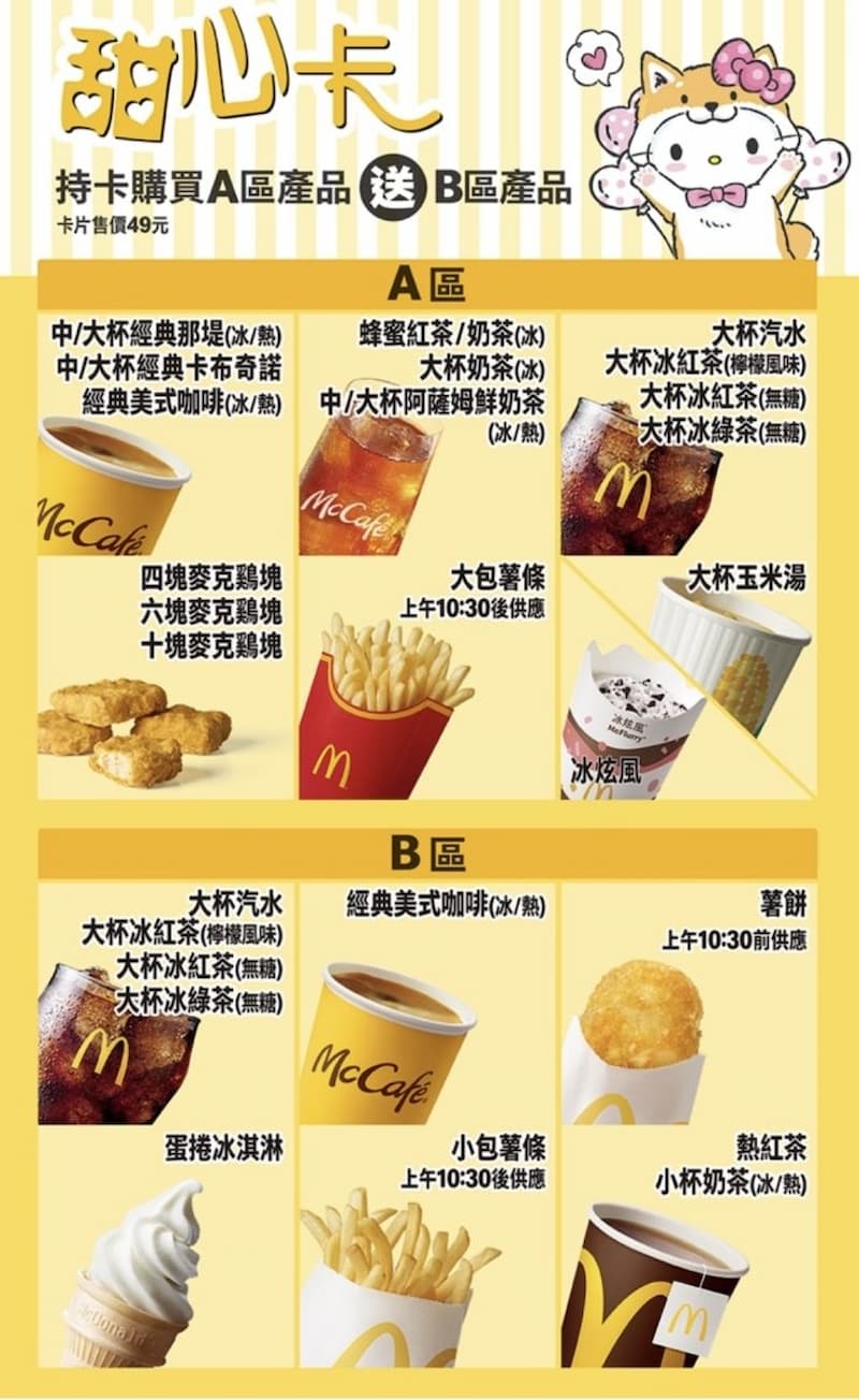 4. 經典 A 餐變成 65 元,跟單點大薯一樣價錢,「主食單點+甜心卡大薯 65 元送飲料」
