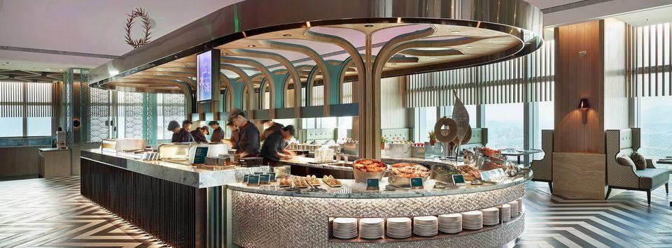 從迎賓燈牆的霓虹燈球,到充滿中式美感的「京山」,再到法式風格的「大快地」,每區呈現獨特氛圍。在吃到飽的同時,賓客還能欣賞到令人讚嘆的高空美景,是一種非常特別的用餐體驗。
