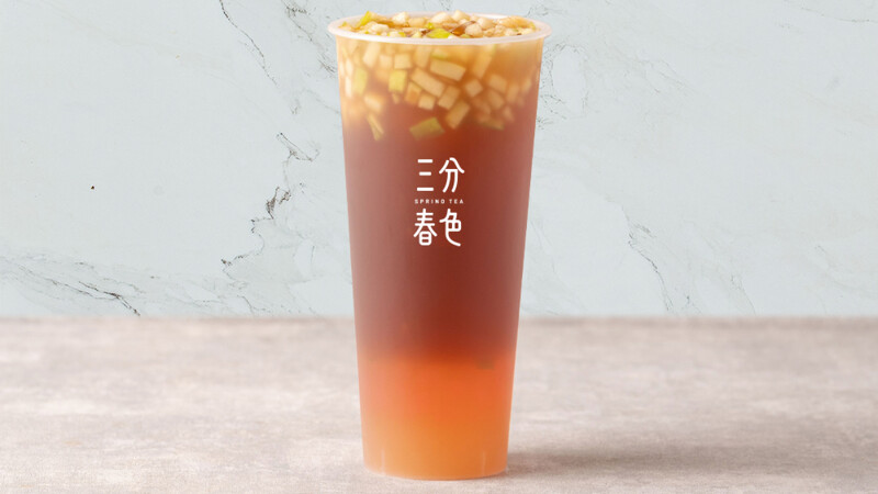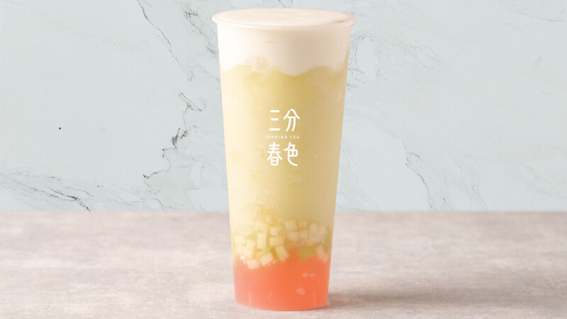 茉莉花綠茶搭配清脆的蘋果丁,打造出口感豐富的顆粒冰沙,再加入櫻花寒天增添層次感。頂部覆蓋著特製奶蓋,口感綿密細緻,帶有淡淡的起司鹹味和蘋果的果香。先品嘗奶蓋的濃郁口感,接著享受清新甘醇的茶湯,清爽怡人,絕對是文青少女不可錯過的必備飲品。