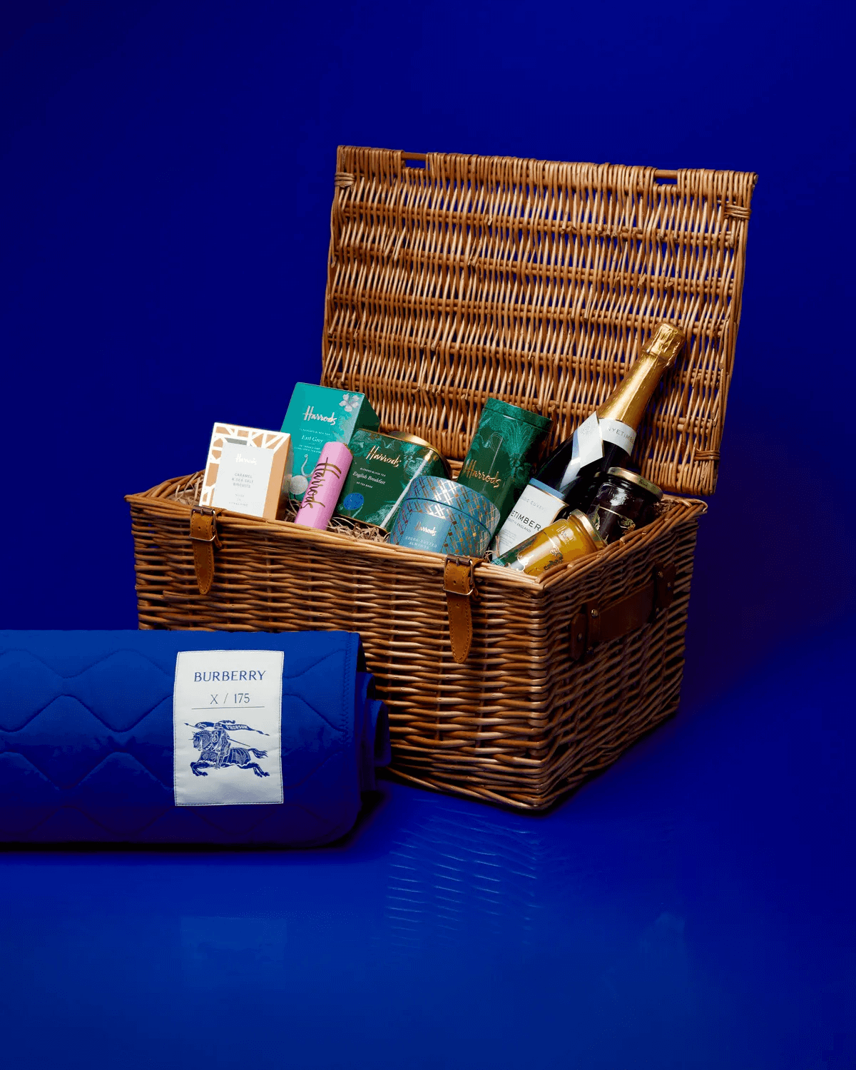 Burberry與哈羅德百貨攜手合作,共同慶祝這家久負盛名的百貨公司於現址開幕175週年的里程碑。為此盛事,Burberry特別訂製了175隻佩戴著迷你手工刺繡圍巾的哈羅德小熊。品牌還精心策劃了以露營為靈感的哈羅德禮籃,其中包含一條限量版的騎士藍野餐毯。