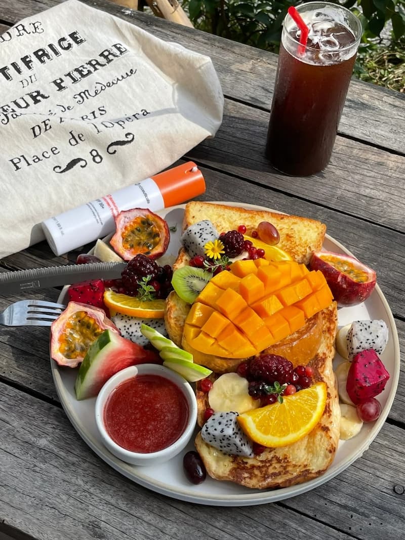 最受歡迎的菜品之一是他們的綜合水果早午餐。這份早餐以大盤子裝載著法式吐司和各種豐富的水果,包括芒果、百香果、樹莓、西瓜、柳橙、火龍果等。光是看著這樣的一道早餐就讓人垂涎欲滴。在泰國這個水果王國,品嚐當地的新鮮水果絕對是一大享受。酸甜的水果搭配香甜的法式吐司,簡直是一場幸福的盛宴!