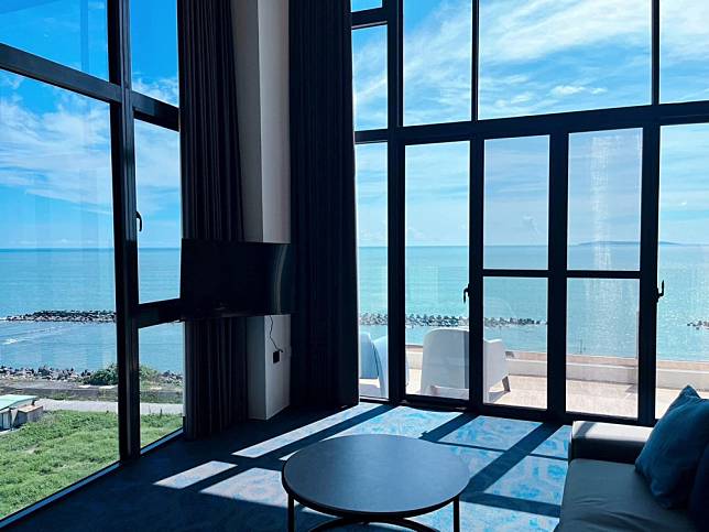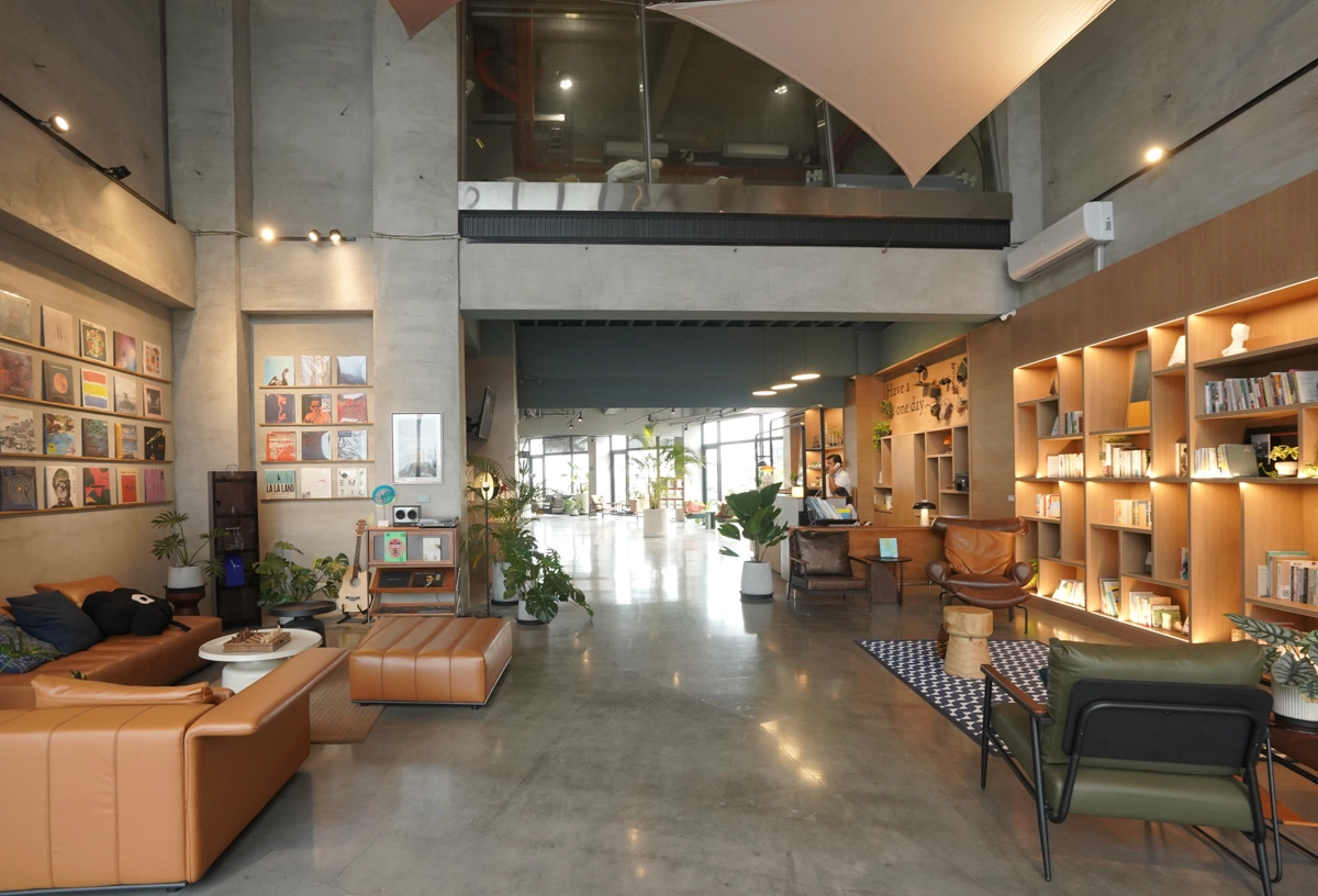緩慢大鵬灣店坐落在大鵬灣帆船基地附近,一棟八層高的清水模獨棟建築,在寧靜的漁村中顯得格外引人注目。走進大廳,即能感受到老闆的品味獨具,他們與新竹的獨立書店「或者書局」合作,精選了超過 500 本與當地、環境相關的書籍供閱讀。此外,大廳還擁有整面黑膠唱片牆和體驗區,讓旅客能在舒適的角落自在地沉浸於美好的藝文世界中。