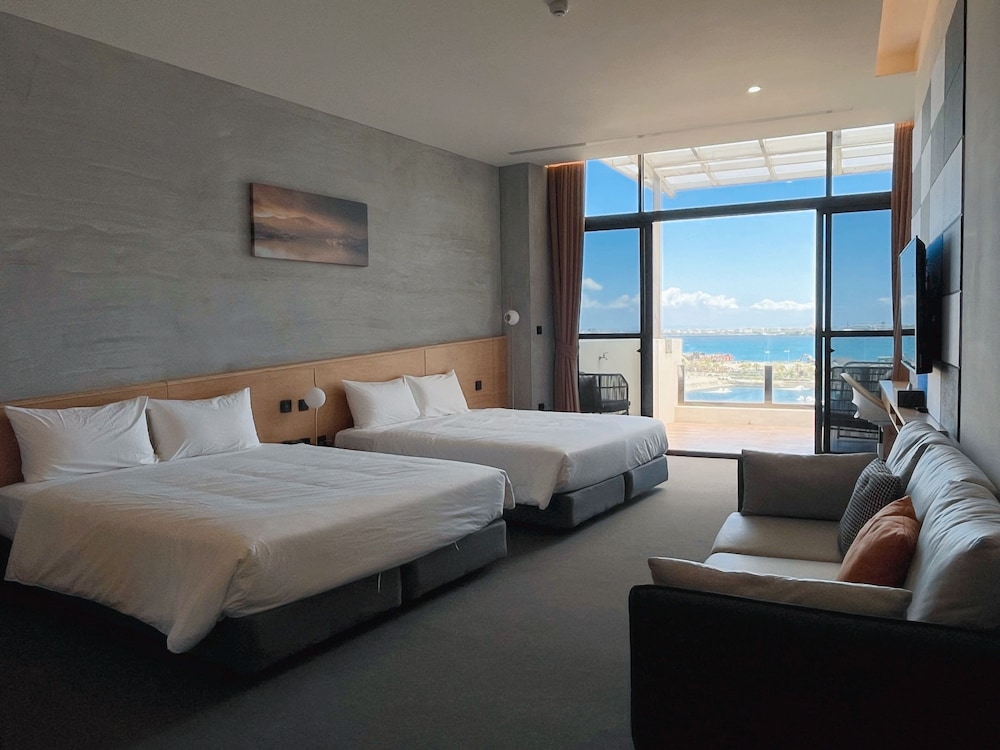 慢步大鵬灣旅店擁有27間客房,每間面積介於10坪至24坪不等。然而,其最獨特之處在於每間客房皆擁有落地窗,讓您盡情欣賞絕美景致。透過窗外,您可眺望台灣海峽與小琉球,享受日落餘暉;而另一側則可眺望大鵬灣與大武山交織而成的壯麗景色。除了酒店內的每一個角落都充滿著用心設計的家具,也践行著永續環保的理念。因此,房間內不提供一次性用品,我們建議旅客自行攜帶所需用品。