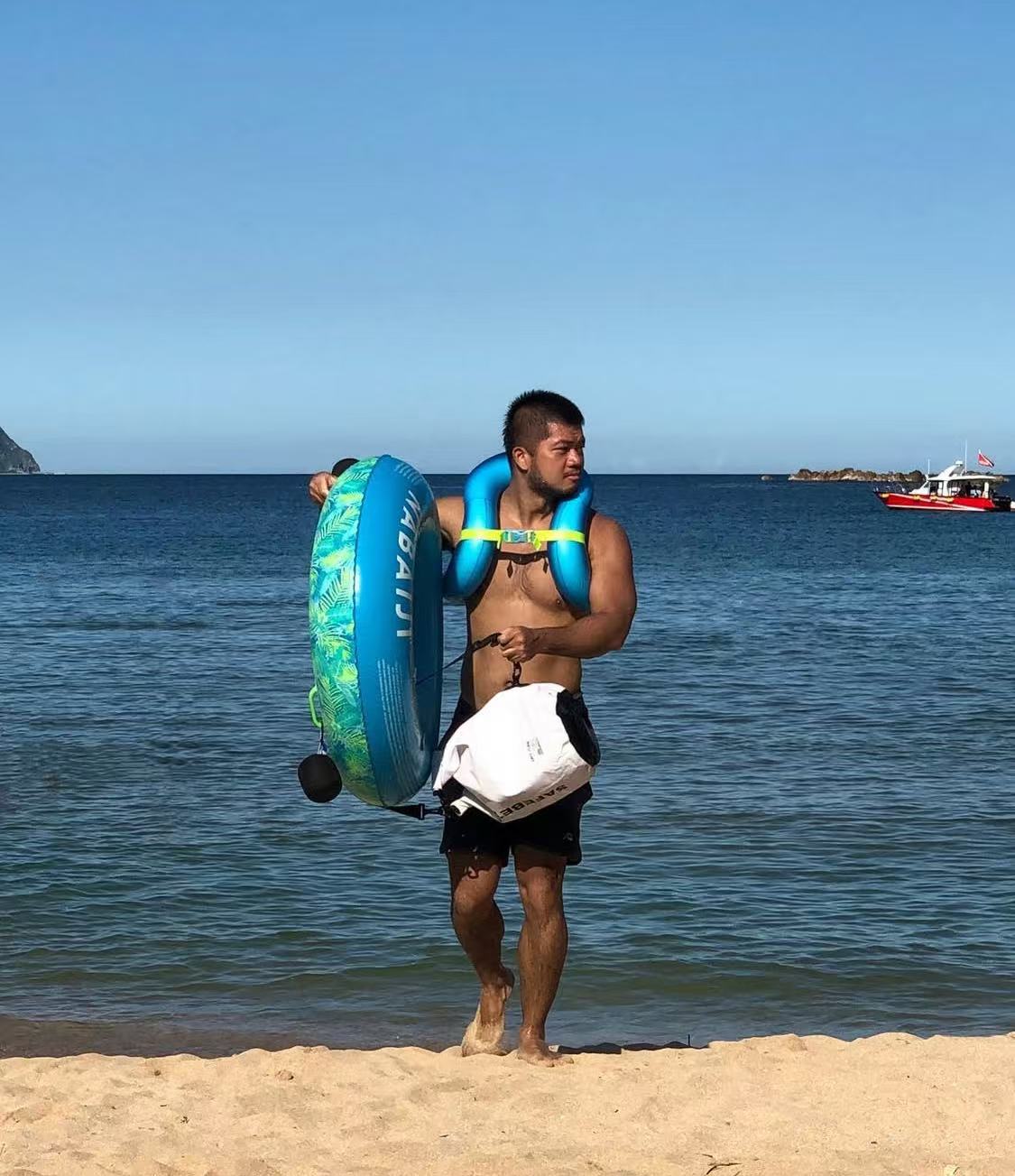 看似健身房練出來的線條,實際是戶外訓練的結果。他不是為了秀肌肉才去海邊,而是因為在海邊,他才能真正展現生活的樣子。跑沙灘、衝浪、背浮板,那雙腿和背肌從來沒放過假。