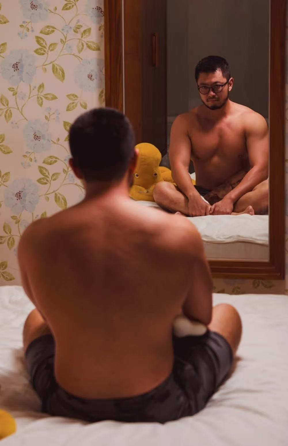 坐在床上,鯊魚望著鏡中的自己。赤裸上身,沉靜地思考或只是靜靜對話。這一刻,鯊魚沒有笑,沒有動作,但眼神裡滿是故事。每個強壯的背後,都有一個安靜的靈魂。
