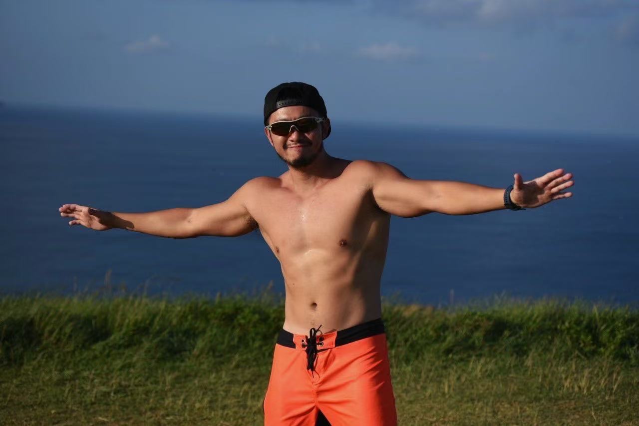 鯊魚站在草原邊緣,背後是寬闊的海與天空,雙臂張開,像是準備擁抱全世界。笑容自信,身材陽光,這畫面不只健康,也很療癒。這是「活著」最帥氣的模樣。