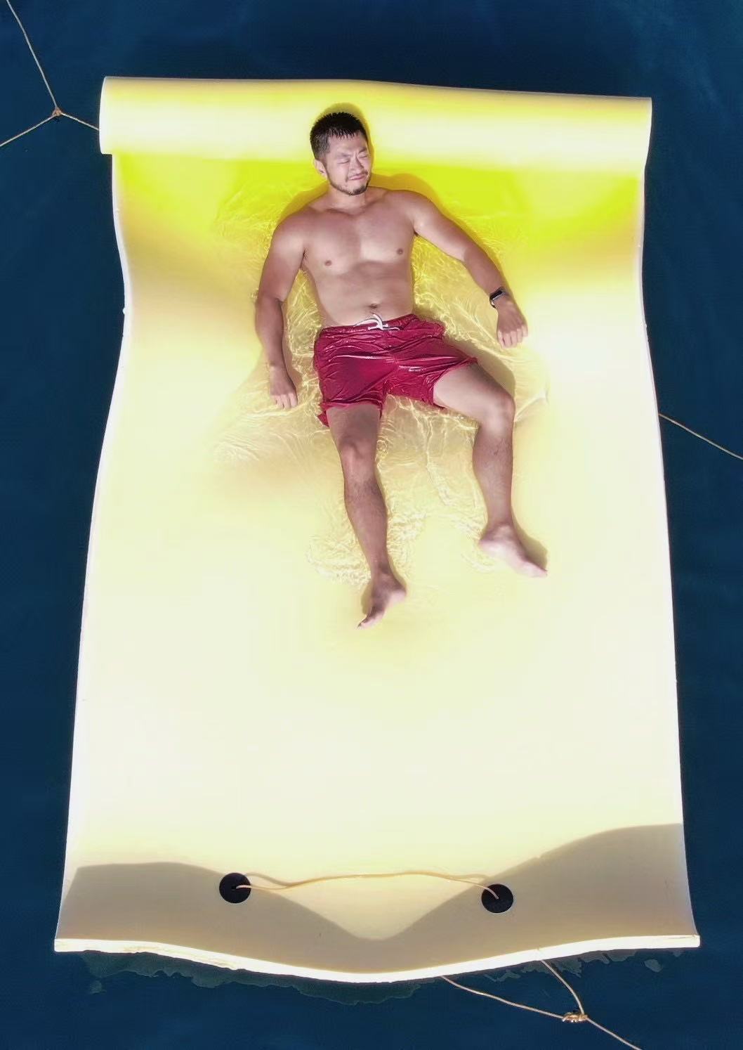 紅色泳褲、黃浮墊,漂浮在湛藍海面上像在拍一部夢幻廣告片。陽光打在胸膛與腹肌上,那一刻沒有風,沒有語言,只有放鬆、自由,與令人微笑的夏日氛圍。