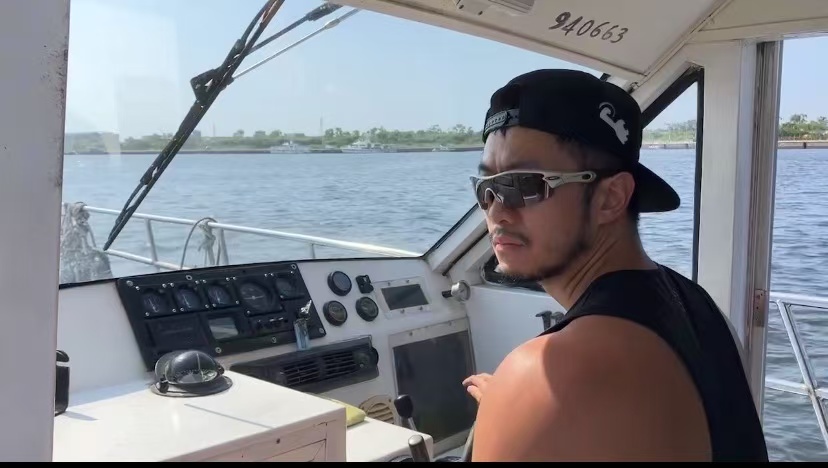 在陽光海面上,鯊魚戴上墨鏡與反戴棒球帽,穩穩地掌握著船舵。這不是炫耀,是他對生活的態度:沉著冷靜,目光銳利,有方向、有掌控,也有讓人依靠的踏實感。