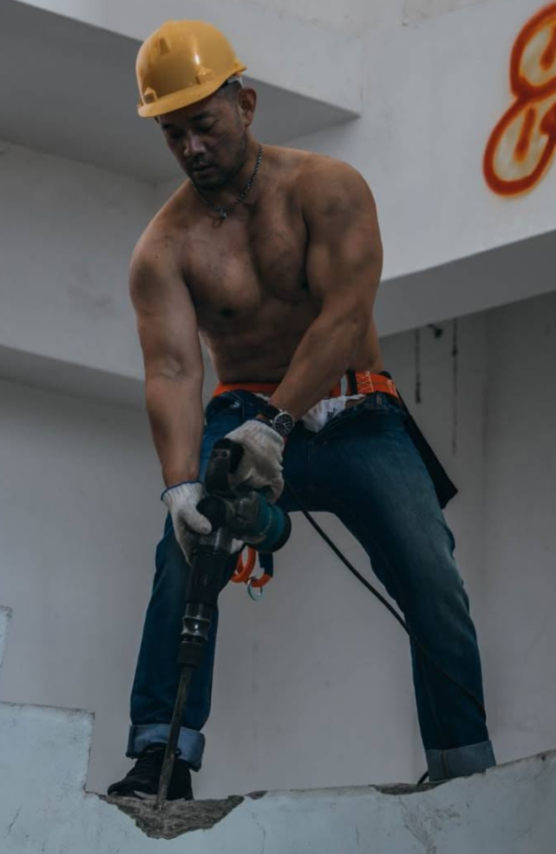 最後一張照片裡,阿力戴著安全帽,雙手握著震耳欲聾的電鑽,全身肌肉繃緊,展現出力量最直接的爆發。他穿著牛仔褲,胸膛裸露,汗水順著線條流下,畫面強烈得像是一場現場演出。這是阿力的原點,也是他的本質——一個在工地裡不怕辛苦、用雙手創造的男人。他的性感來自勞動,而不是裝飾;他的帥氣來自真實,而不是粉飾。看著這張照片,你幾乎能聽見鑽頭轟鳴的聲音,也能感受到那股震撼人心的魄力。