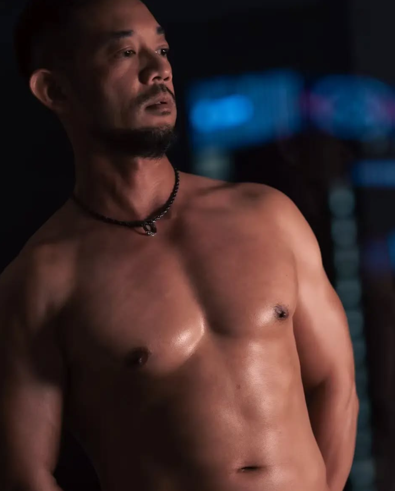 夜幕下,微光打在阿力結實的胸膛與肩膀上,他沒有動作,只是靜靜地站著。眼神望向遠方,帶著幾分迷惘,也有幾分堅定。這張照片少了笑容,少了勞動或華麗的外在,而是把阿力最內斂、最孤獨的一面呈現出來。肌肉依舊閃耀,但比起炫耀,更像是一種生命歷練的痕跡。這是一個屬於阿力的靜止時刻——在喧鬧的白天過後,他終於讓自己與城市保持一段距離。性感與哲思同時存在,讓人忍不住想更靠近,卻又感受到那份無法輕易打破的距離感。