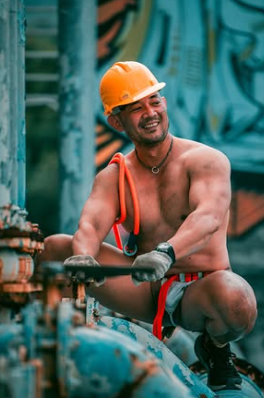 阿力戴上安全帽,身上幾乎沒有多餘的衣物,只有必備的護具與繩索,滿身肌肉在烈日下閃閃發光。他的笑容真誠而自在,像是早已習慣在這樣的環境裡與鐵管、水泥為伍。手上的厚繭與結實的前臂,證明他不是只為了拍照才擺姿勢,而是真正從工地裡走出來的男人。那種專注與放鬆並存的神態,散發出一種原始的性感,粗獷卻不失溫暖。阿力的魅力在於,他不需要多說什麼,光是這副真實的身體語言,就足以讓人感受到他的力量與自信。