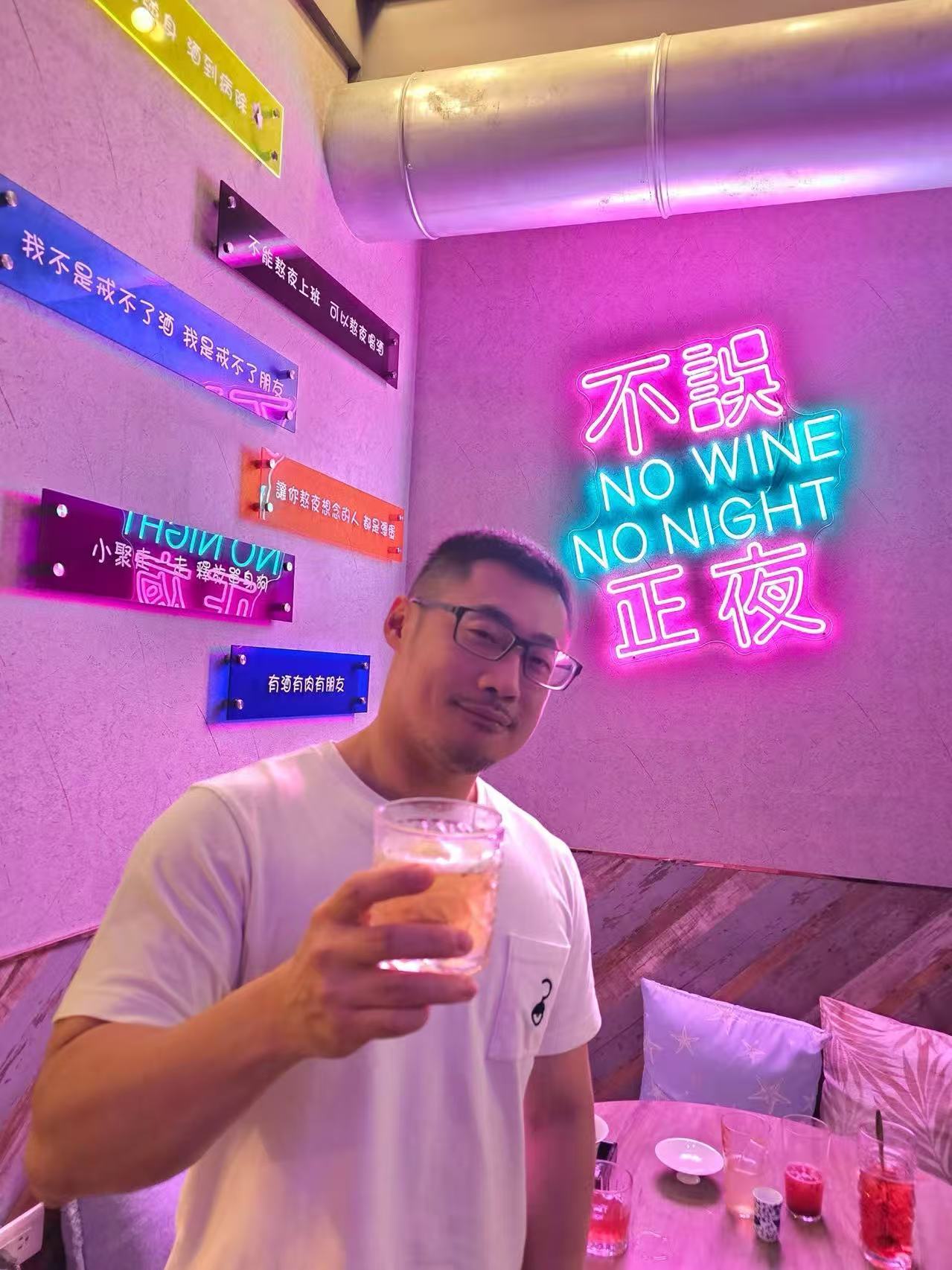 如果白天的阿簡像大漠風光,那晚上的阿簡,大概就是幾許薄酒。背景寫著「NO WINE NO NIGHT」,粉紅和藍色的霓虹映在牆上,也映在他臉上。輕挑的色調映出微微的笑意,有點溫柔、有點壞;敬邀諸君,不誤正夜。