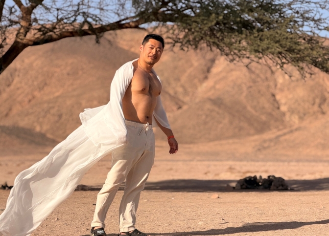 沉穩的氣質,搭上厚實的胸膛。不似健身房刻意雕塑的線條,而是一種長年累積的壯闊感,像山、像石,像撒哈拉沙漠中,被亙古的風砂磨過的岩壁,看似質樸,望去卻是震懾心弦。很多人第一次看到阿簡,都會愣一下;因為他的氣場很奇妙:不張揚、不浮誇,但整個空間好像會自動沉澱下來。