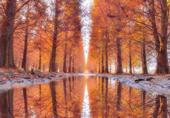 新竹「六塘公園」佔地雖不大,落羽松也就十來顆,但擁有攝影們最愛的「鏡面落羽松」景觀,沿著湖邊小徑散步,你會發現每個角落拍起來都像一幅畫,如果有空拍機的小夥伴也可以讓鏡頭飛行到最上方,你會發現其實湖面的形狀是一顆鏡面愛心!
