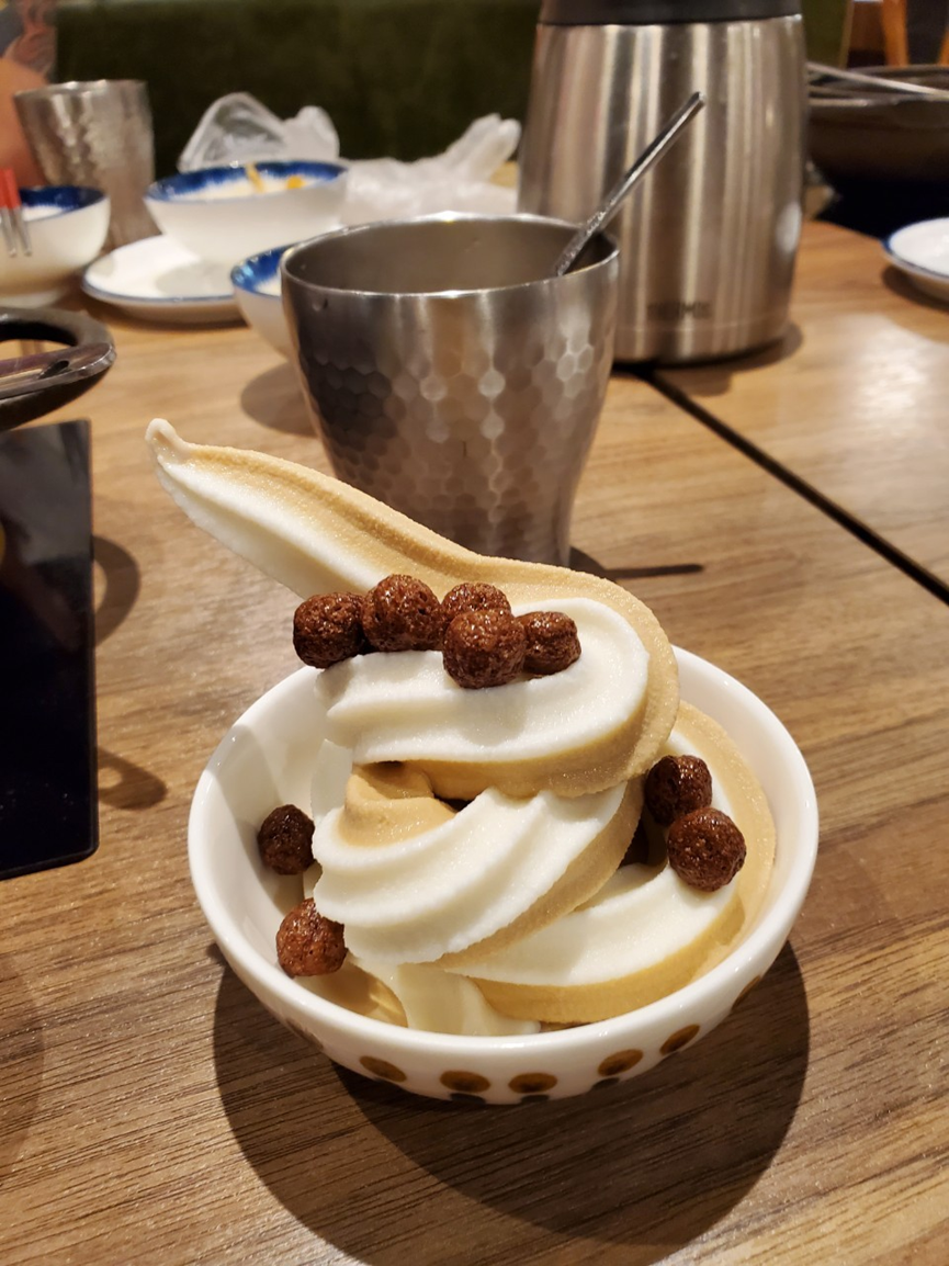主鍋用餐完畢時,再來就是各家店的甜點靈魂,「尬鍋」當季的甜點也是不容小覷,聽說有很多顧客都是為了霜淇淋而來的!除了口味與一般的店家不同外,旁邊還有很多可以額外添加的小點心,頓時改變了霜淇淋一入既往的單一豐富性。
