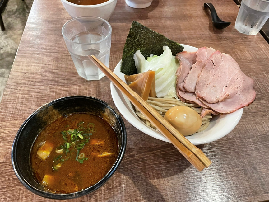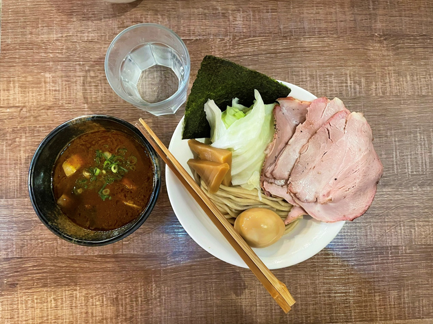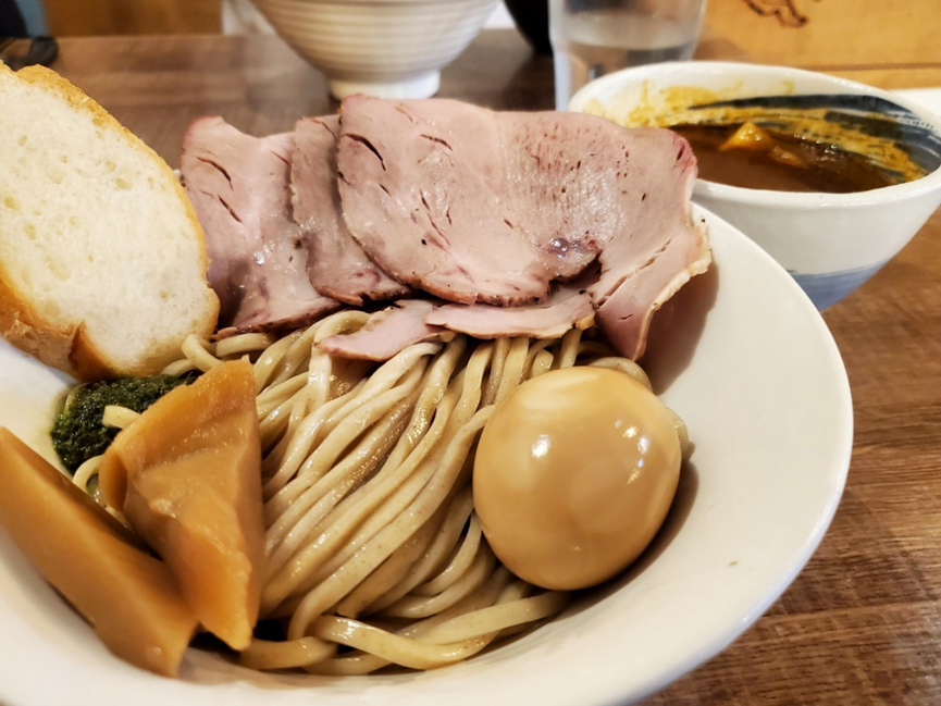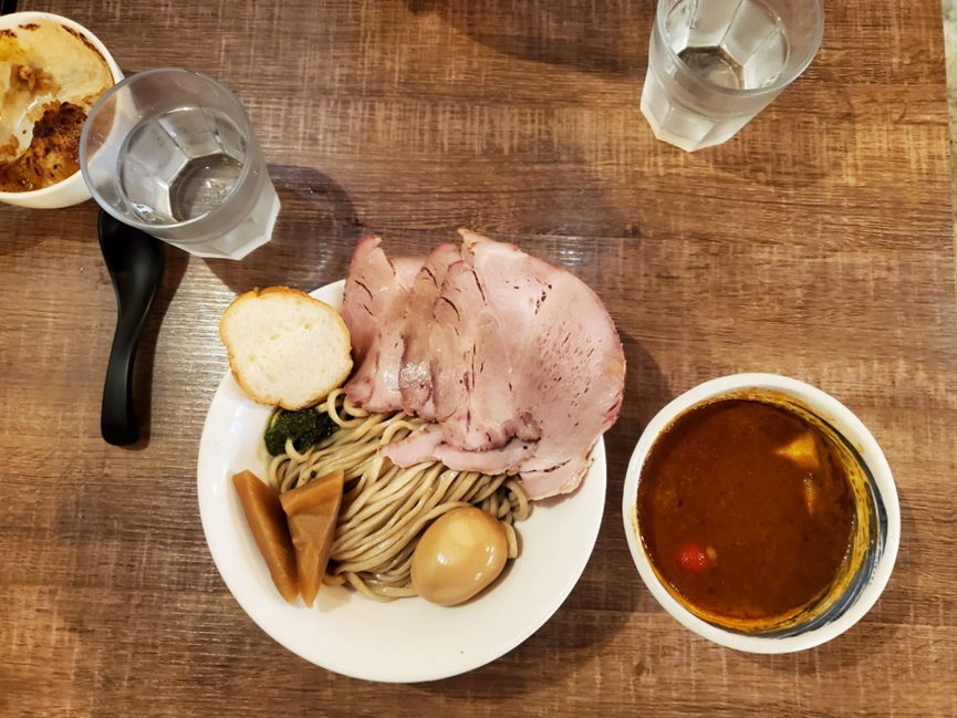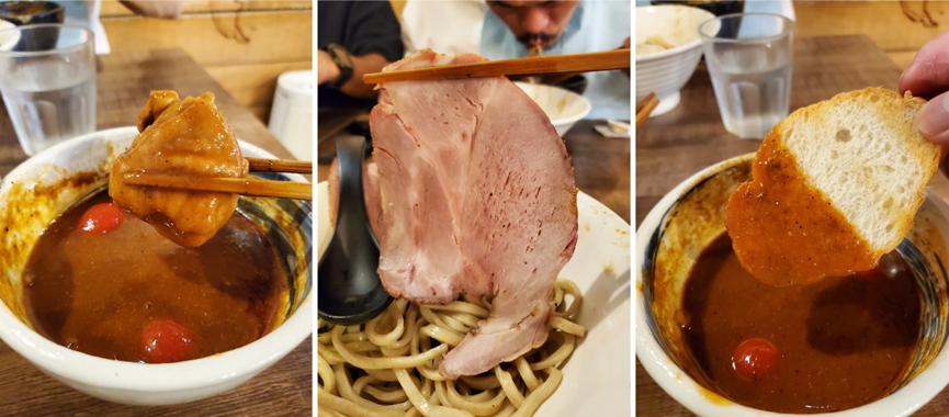 與上一道「濃厚豚骨」不同的番茄版,「濃厚豚骨番茄」少了海苔,取而代之的則是切塊法式麵包,沾醬裡頭除了多加了小番茄,其他與上一道沒有太大的差別。